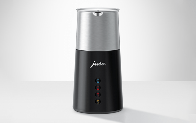 En särskild höjdpunkt är chokladmjölken, som kan tillredas med bitar av fina chokladkakor tack vare den kraftfulla tekniken. Mjölkskummarens design imponerar med en elegant och funktionell utformning. Med endast fyra symboler är den enkel och okomplicerad att använda. Mjölkbehållaren sitter stadigt i den koniska basen och utstrålar stilfull och harmonisk enhetlighet. Tack vare den lätt böjda kanten häller du den skummade mjölken eller chokladmjölken exakt och utan att spilla. Mjölkskummaren Hot & Cold är det perfekta komplementet till Pure-Coffee-kaffemaskiner från JURA och blir snabbt en oumbärlig följeslagare när du ska tillreda kaffe.