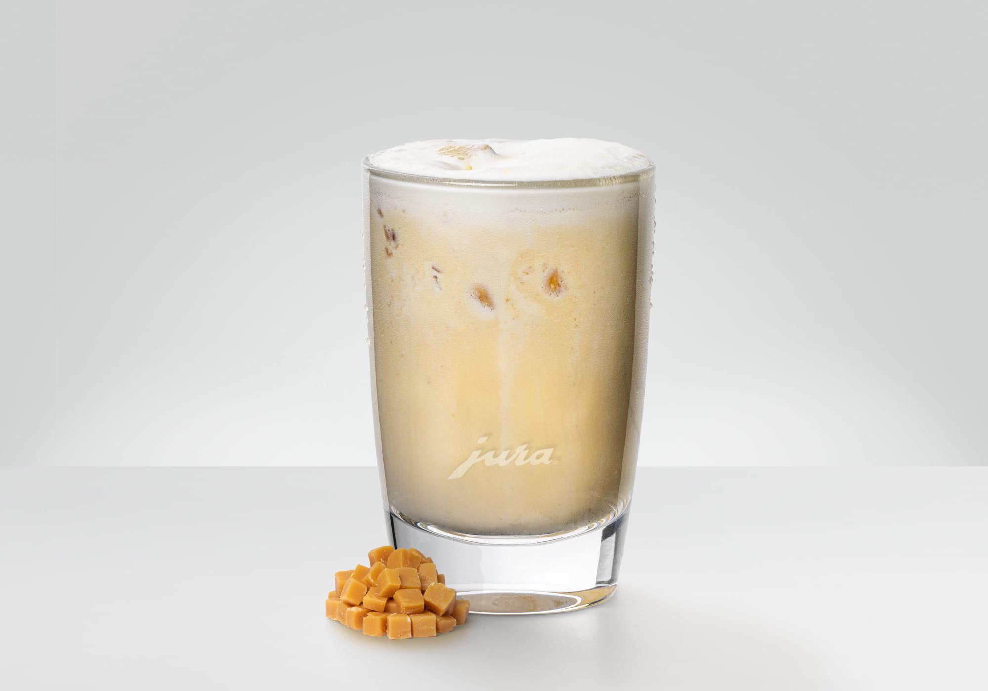 • Ta ett litet latte macchiato-glas och lägg i två kulor Almond-Salted-Caramel-glass.